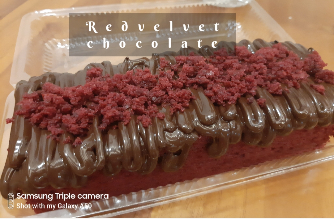 Kek Red Velvet Chocolate dihiasi dengan ganache chocolate yang lazat. Rasanya tidak terlalu manis.